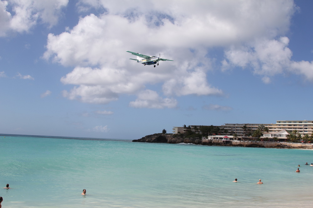 На подходе к полосе , перед нами было пару борот и мы ждали своей очереди. И вот торжественный момент наступил! Мы заходили на один из самых известных и красивых аэродромов. Перед нами была бухта , справа и слева закрытая островной частью, в самом центре бухры был небольшой узкий пляж, шириной наверное метров 20 и сразу же за ним начинался торец полосы. Сам пляж был тоже коротким, ну может метров 150. С одной стороны пляжа стояла большая кафешка с огромной терассой полностью забитая туристами, с другой стороны пляжа были постройки похожие на отель. Мы достали свои видео-фото принадлежности и начали снимать. Как вы понимаете миг счастья длился всего несколько секунд, мы пролетели над пляжем и через мгновение коснулись полосы, дальше все было уже привычно,- руление, парковка … Мы достигли своей конечной точки!