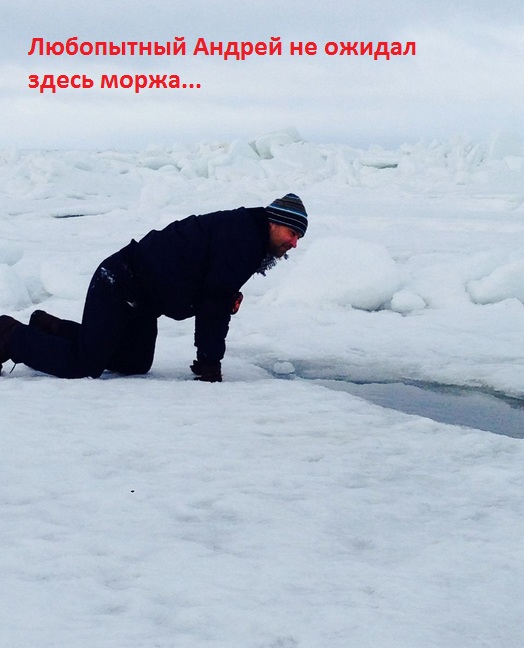 На льдине мы разделились на две группы: "дети с родителями" и "одинокие путешественники". Первую группу сопровождал героический Олег Продан, вторую - профессор, обладатель энциклопедических знаний, Андрей Евгеньевич. Видимо, чтобы не создавать крен льдины, группы разошлись в противоположные стороны от вертолетов.