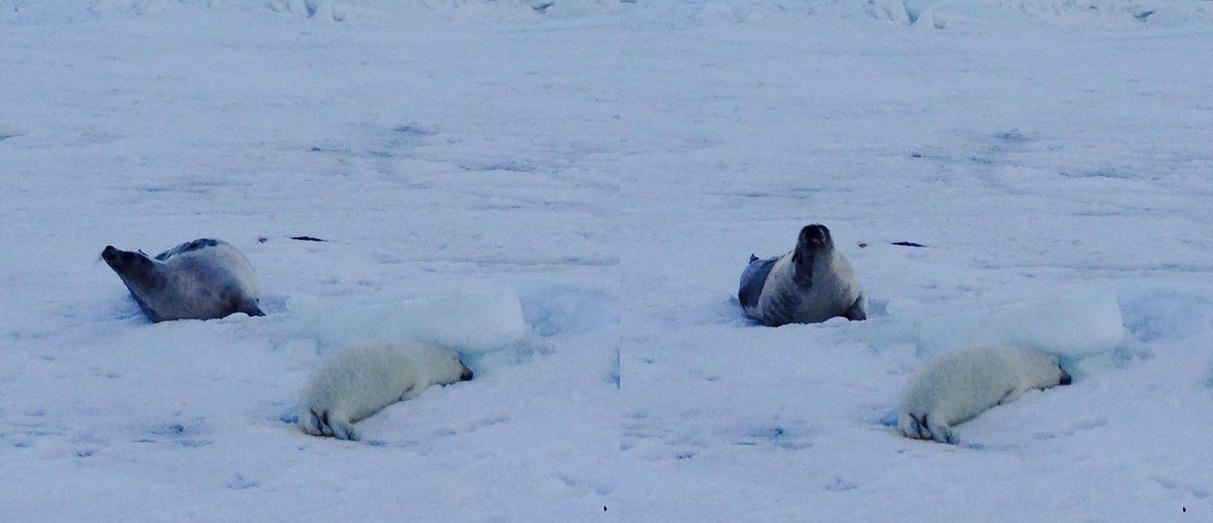 Позже она выходит на лед только для молочного кормления, а остальное время проводит в воде, периодически выглядывая для контроля, обучения и воспитания отпрыска