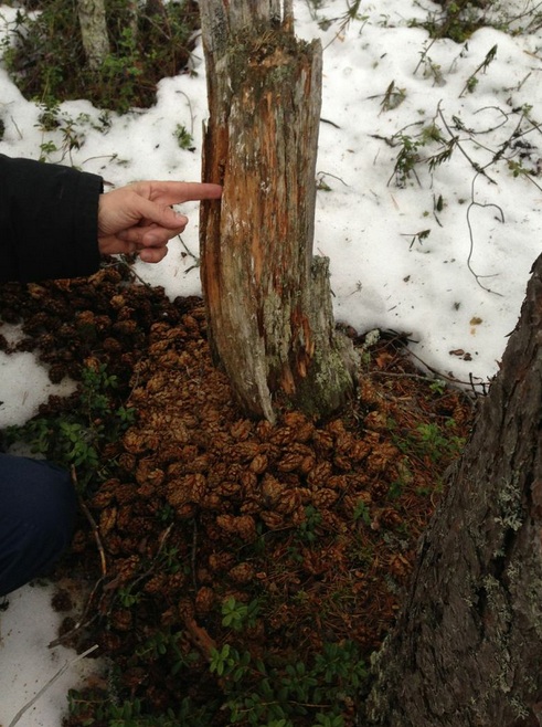 Оказывается, что делает безрукий (в прямом смысле), но мозговитый дятел – он находит подходящую по размеру расщелину в стволе дерева или пня, приносит в клювике сосновую шишку, вставляет ее плотненько в щель и неспешно трапезничает, вытаскивая по зернышку и смакуя каждое мгновение.