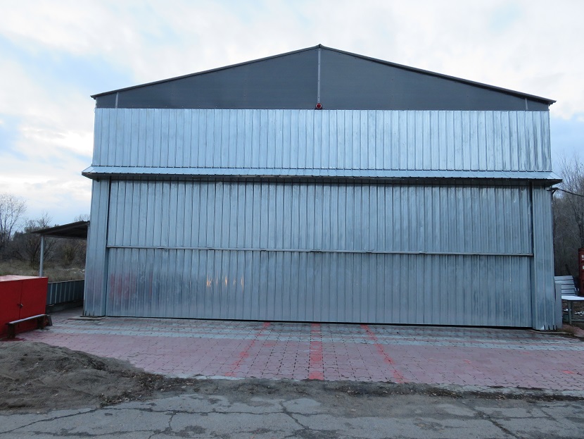 За счет большой высоты ангара, была применена довольно оригинальная конструкция ворот, они открываются, поднимаясь книжкой вверх. Такая схема не занимает дополнительной площади, электрифицирована и работает с «одной кнопки», абсолютно не зависит от снега, льда и т.д.