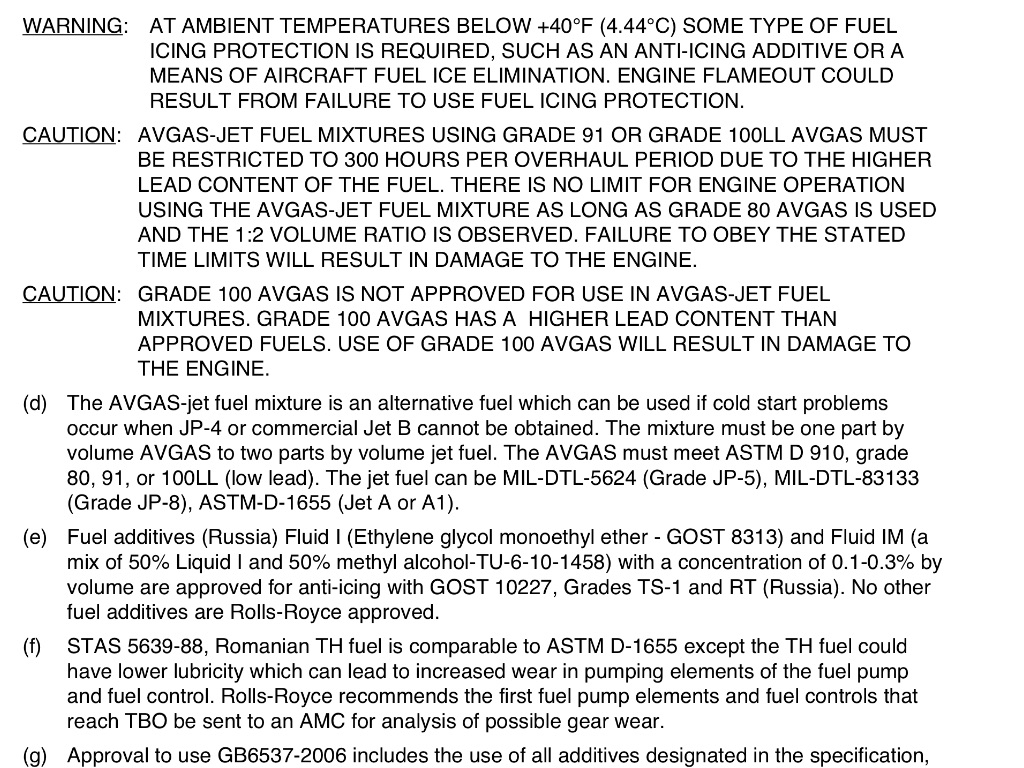 DO NOT USE GRADE 100 AVGAS IN AVGAS-JET FUEL MIXTURES ... USE OF GRADE 100 AVGAS WILL RESULT IN DAMAGE TO THE ENGINE.