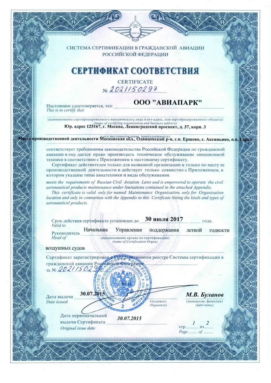 Организация по ТОиР АТ имеет Сертификат соответствия, сфера деятельности которого распространяется на следующие типы ВС: R44, R44 II, R66.