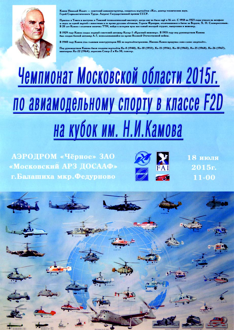 18.07.2015 на аэродроме "Черное" проведен чемпионат Московской области 2015 года по авиамодельному спорту в классе F-2-D на кубок им. Н.И.Камова.