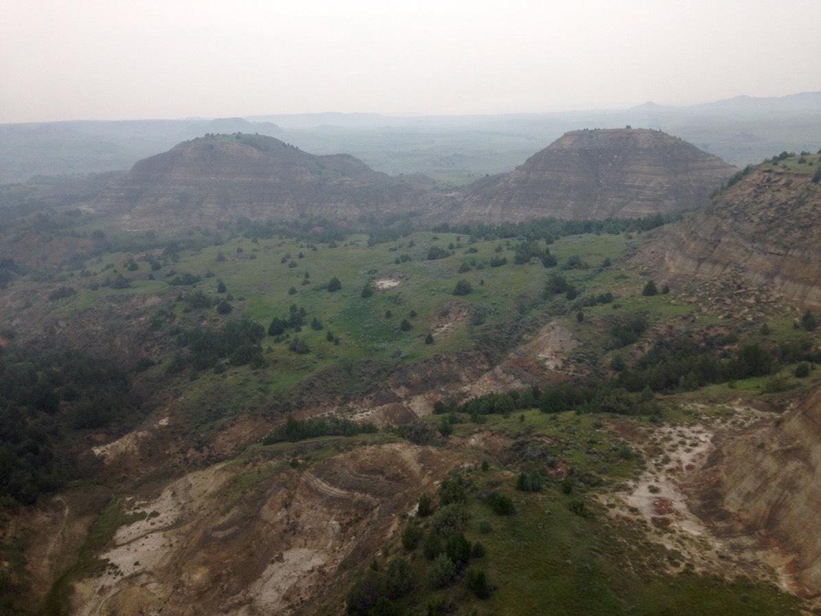 После дозаправки погода окончательно испортилась и до Башни Дьявола (Devil tower) я так и не дошел. Хотел, но дождь превратился в какой-то тропический ливень и горы закрылись тучами. Отвернулся в сторону крайнего на этот день объекта: национального парка Теодора Рузвельта. Парк оказался опять про занимательную геологию. Очень причудливых форм вспучения на земной поверхности. Будто древние гейзеры изливали содержимое недр и так застыли. Шапки многочисленных холмов имеют разноцветный концентрический окрас.