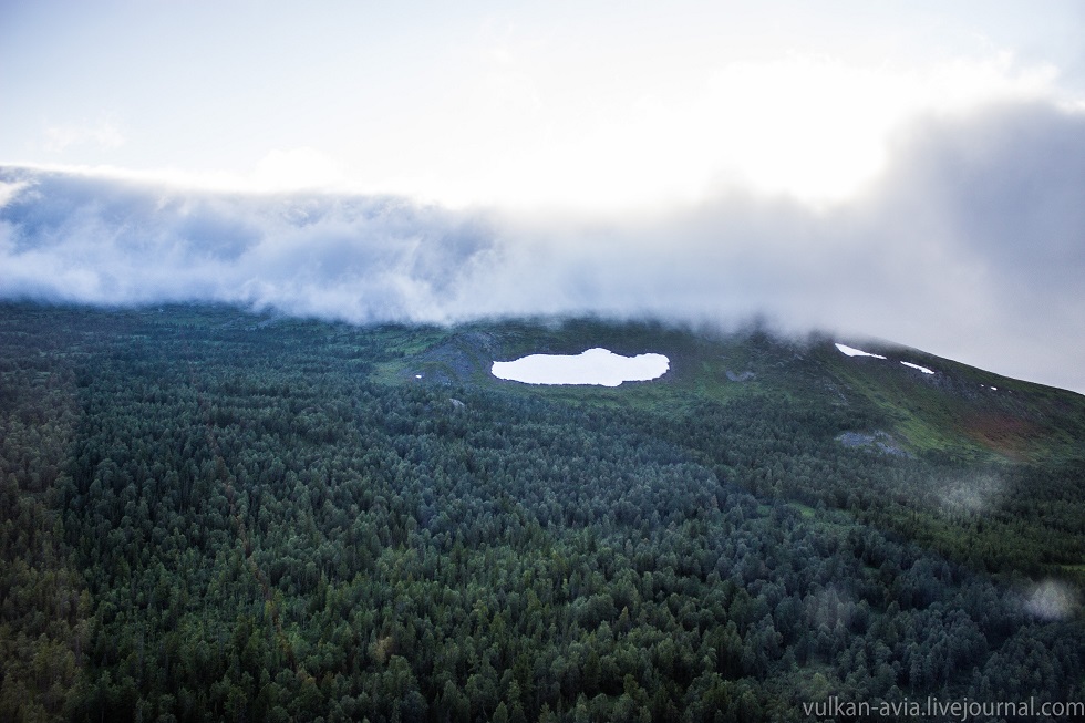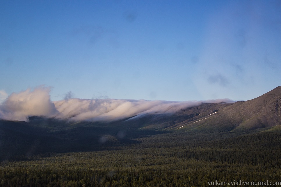 Следующая остановка с ночевкой и заправкой соткой в Инте. Вперёд, на Север! Мы опять полетели отдельно друг от друга. :) Второй экипаж решил посмотреть на высочайшую гору Урала. А я , не имея опыта горных полётов, на гружёном вертолете решил уйти в тундру и пройти по западным склонам. Не всё так просто оказалось. Пока мы развлекались у Пупов, с запада натянуло какую-то хрень. Урал все это задержал, и эта дрянь стала наслаиваться на западных склонах. Потрясающая картина! Все горы залиты солнцем, а на западных макушках лежит слой облачности и не может перелезть через горы :) Но нам-то надо именно туда!