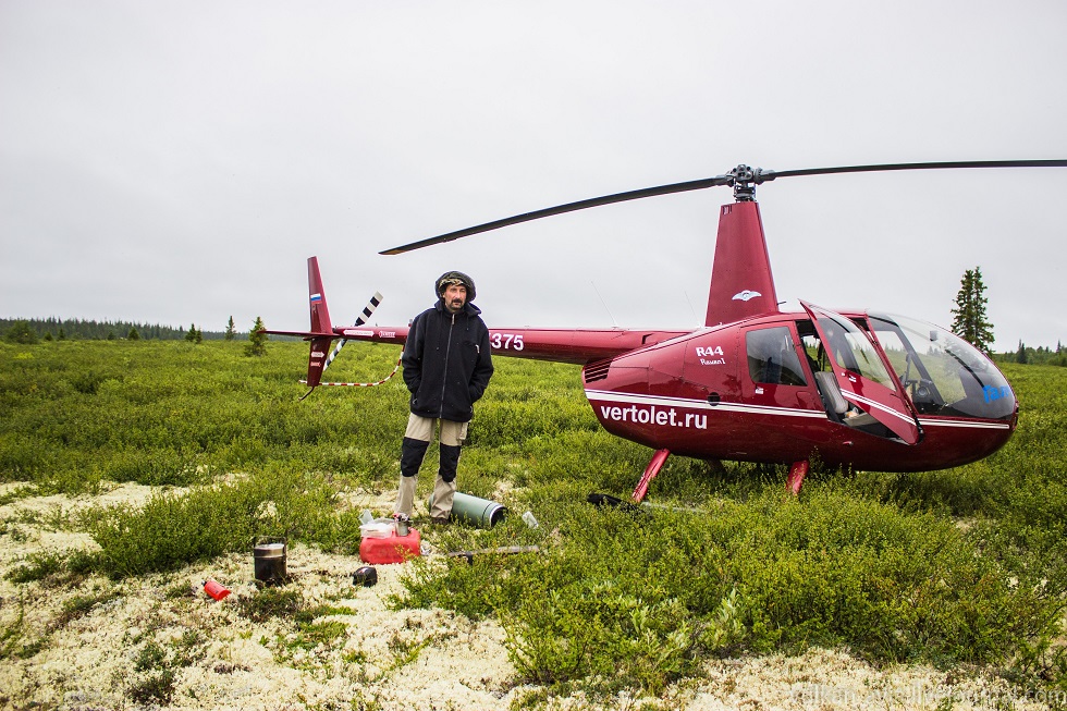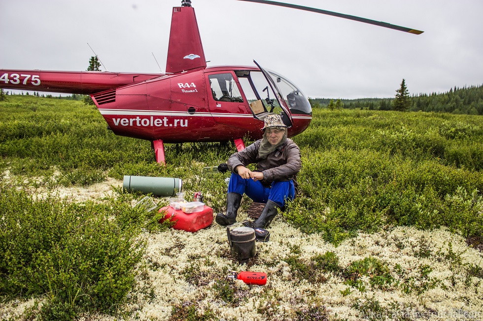 Я начал присматривать площадку для " переждать" на случай совсем плохой погоды. Плохая погода не заставила себя долго ждать. Я развернул вертолёт и приземлился на высокий бережок какой-то тундровой речки. Второй экипаж был более подготовленным и продолжил полет. Мы с Андреем оказались в тундре в 60 км от Инты. Утром в отеле мы не успели попить кофе и с радостью это сделали тут. Кругом очень непривычный пейзаж для жителей Москвы. Как на другой планете. Тундра!