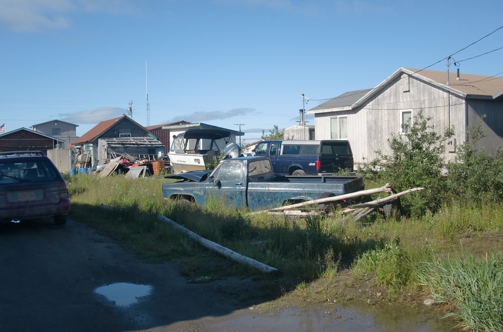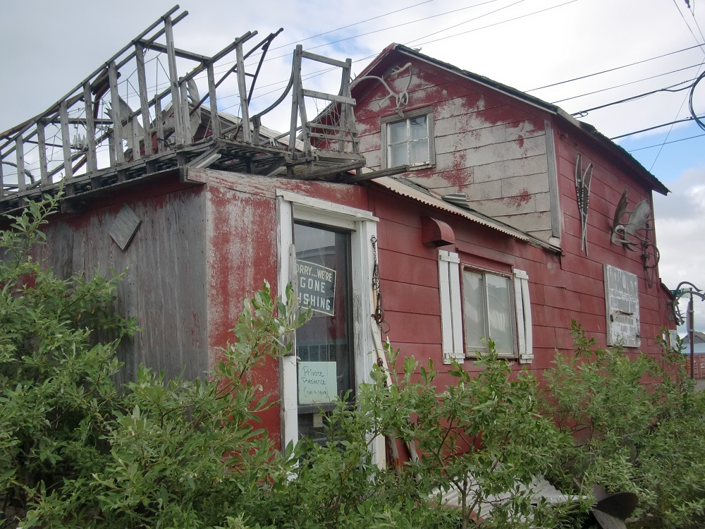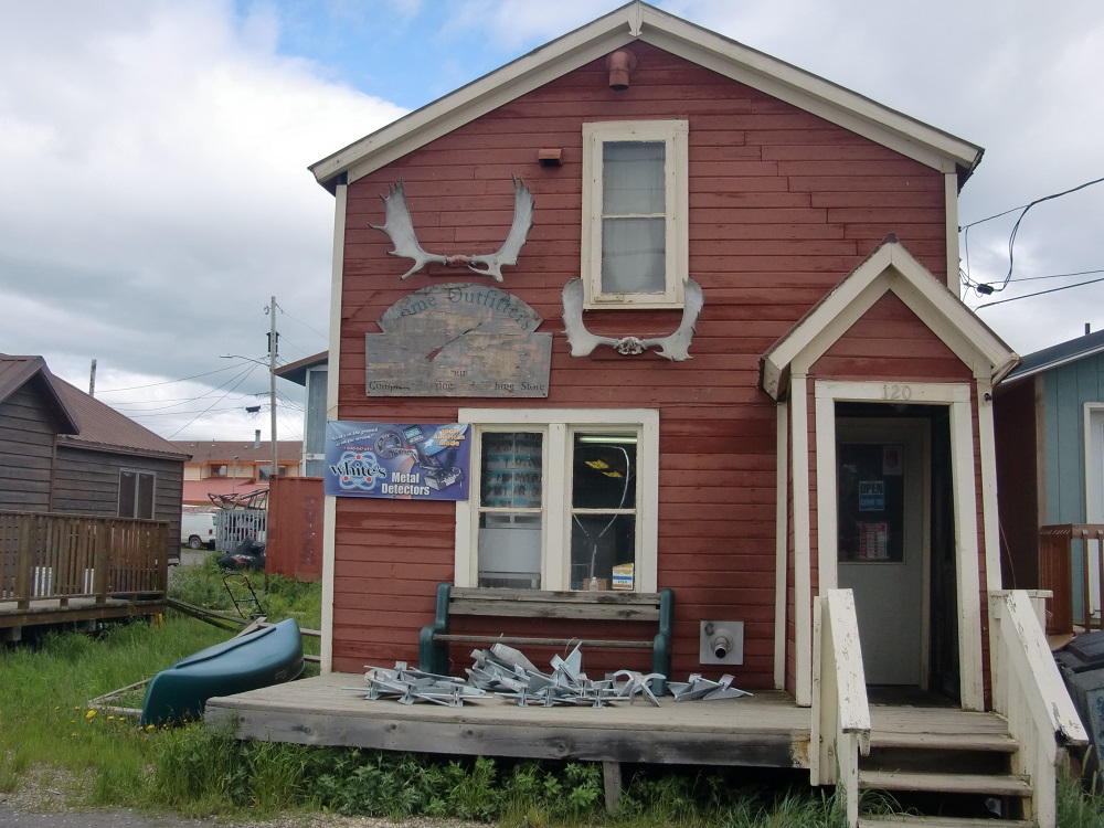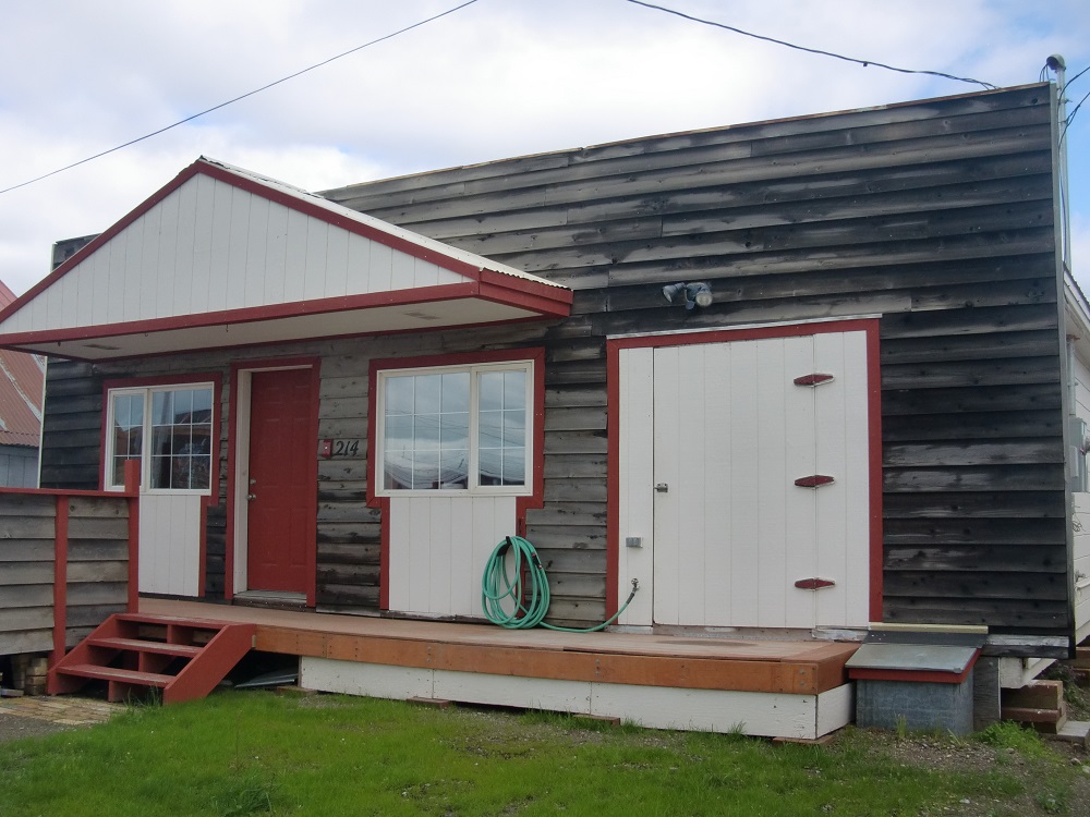 Местный "белый" дом  с северным уклоном. В оформлении вместо цветочных горшков повсеместно используются ковши от драг - большие и не очень.