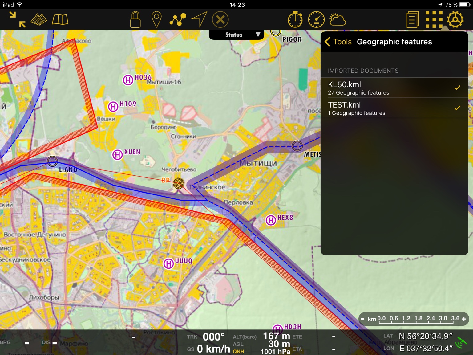 В тестовых целях я экспортировал КЛ-50 из Google Earth и залил в Air Navigation. С первого раза не получилось, так как я в опциях экспорта не указал цвет МВЛ. Поэтому она не отобразилась на экране. А как только указал красный цвет (для примера), то МВЛ сразу появилась на экране. См скриншот #3.