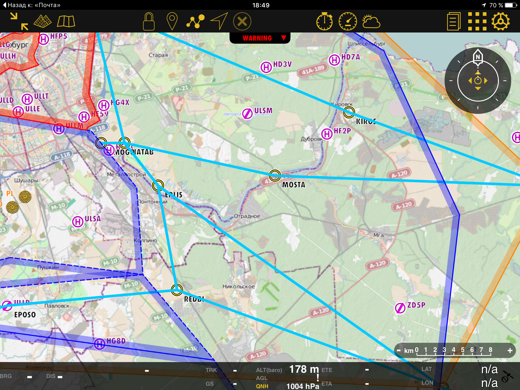 Пока немного кривовато и грешновато, то можно этот файл грузить себе на почту, а потом в почте на айпаде удерживать пальцем и выбирать в меню "Открыть в Air Navigation PRO". Файл большой - почти 8 мегабайт, а ВТ - все 18, поэтому Air Navigation уходит в глубокую задумчивость примерно минуты на 3-5, в зависимости от производительности айпада, после чего говорит, что файл успешно импортирован, а на экране появляются МВЛ и ВТ.