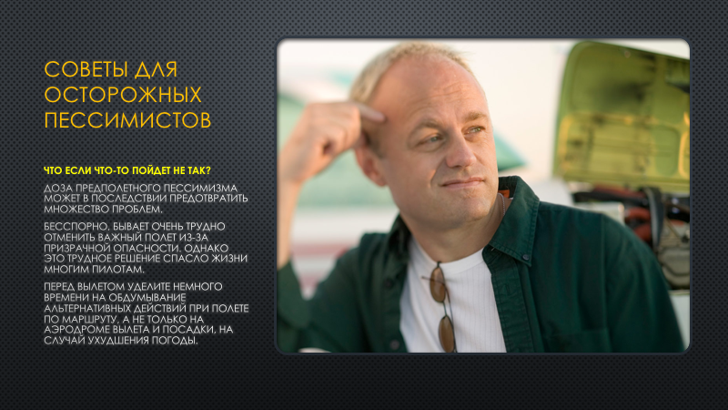 Игорь, логика аналогичной программы АОПА в США заключается в создании как теоретического, так и практического курса. Теоретическую я переработал и подрихтовал под российскую действительность, убрав несуществующие у нас метеосервисы и т.п. Плюс, немного доработал текст и процедуры, которые описаны в оригинале. Осталось создать короткий практический курс по выводу ВС из непреднамеренного попадания в СМУ, чтобы завершить проект. Но пока ни один российский инструктор, с которыми я говорил на эту тему, не изъявил желания создать летную часть программы и описать как техническое оснащение, так и методику обучения частных пилотов выводу ВС из СМУ. Как говорится, будем искать...12345 писал(а):Удивил. Что во что упёрлось? Совершенно рутинная деятельность. Никаких проблем в реализации нет. Проблема только в принятии решения - развернуться или влезть по "самое не могу".