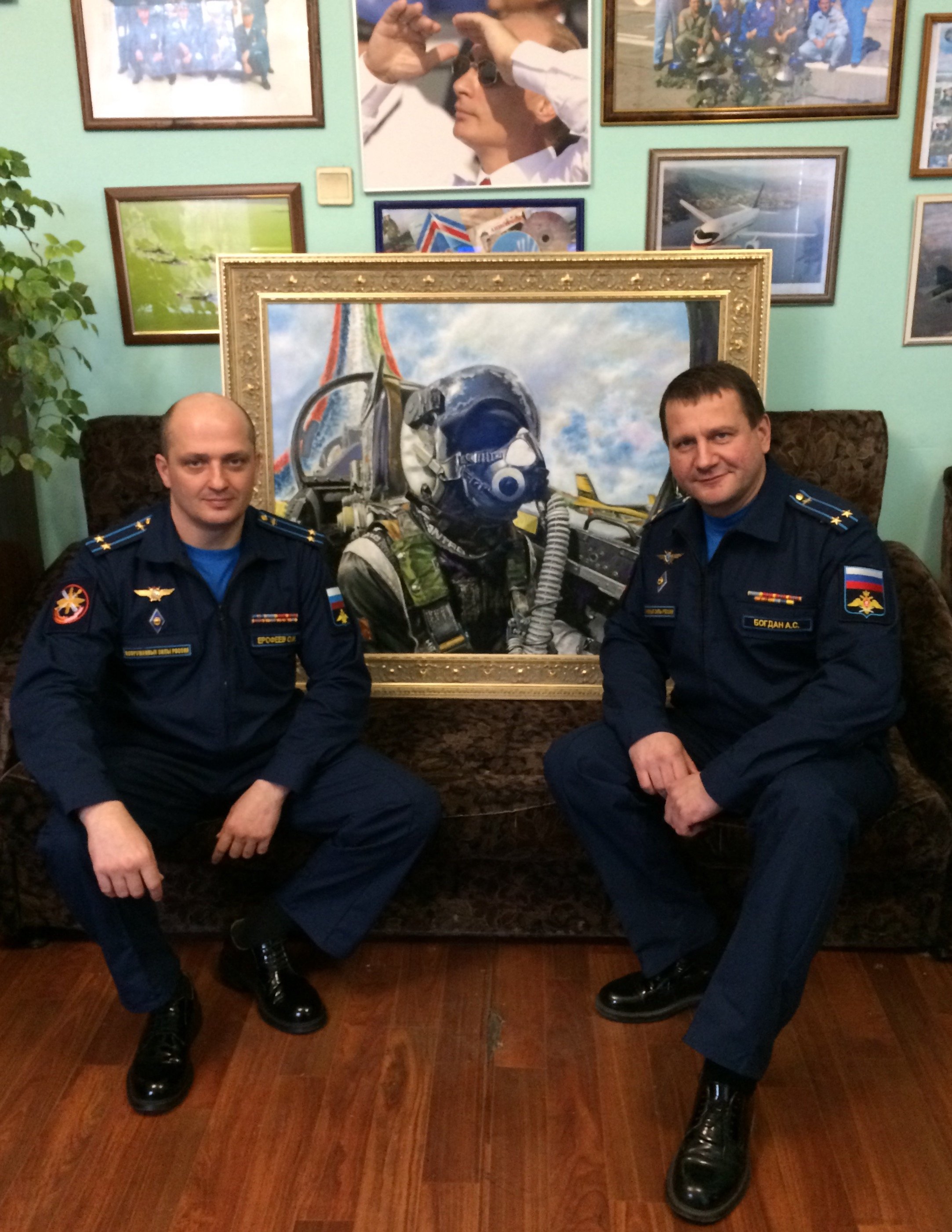 Лётчики "Русских Витязей" подполковники Ерофеев и Богдан в кабинете командира пилотажной группы с картиной "Художники неба".