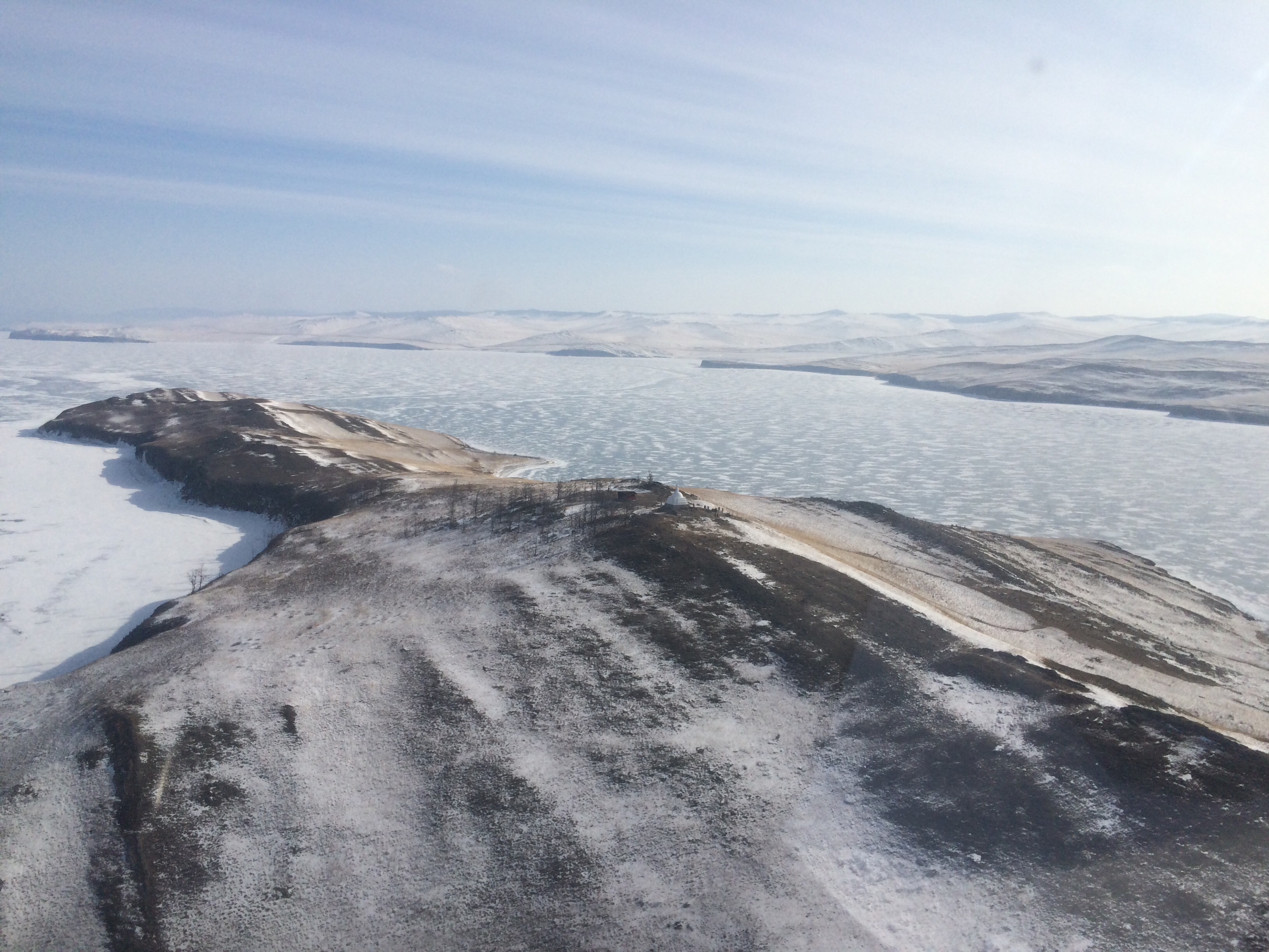 Садимся на лёд. Надо смотреть было как они выходили, каждый вновь ступающий на лёд до последнего держиться за вертолёт, ногу подкашиваются. Ещё бы чистый прозрачный лёд. Ощущение что ты стоишь над бездной и что тебя держит непонятно. Через 5 минут группу украинских товарищей пришлось вернуть в реальность, мы то своё дело сделали, но процесс съёмок никто не отменял а график уже сдвинулся вправо. Мы пользуясь паузой делаем с набежавшими и прикатившими на коньках, лыжах, буерах, машинах фотографии с вертолетом. Сегодня д выходной по всему малому морю снуют автомобили, вдоль берегов двигаються туристы. Через час закончив съёмки мы собираемся перелетать на место ночёвки в турбазу. Оператор просит снять вид из кабины на Регину. Мы как честные сразу предупреждаем она охренеет от создаваемого нами потока. Все предупреждены полетели. Оператор сидит привязанный всеми ремнями к вертолету, открыли дверь ему снимает, на втором круге Регину просто сдуло, она гонимая потоком от винта поскользила в сторону острова Ольхон. Съёмку на этом решили прекратить. Выбросив на лёд все барахло и со скрипом вернув паспорта телевизионщикам прощаемся до утра. Рекомендуем жирную пищу и одеть все тёплые вещи на себя, в глазах тоска, они понимают что только мы можем их оперативно вытащить в цивилизацию. И эх, мы зажгли, оператор аж присел когда вертолёт перестал помещаться в камере и промчался над головой на высоте 3 метров.