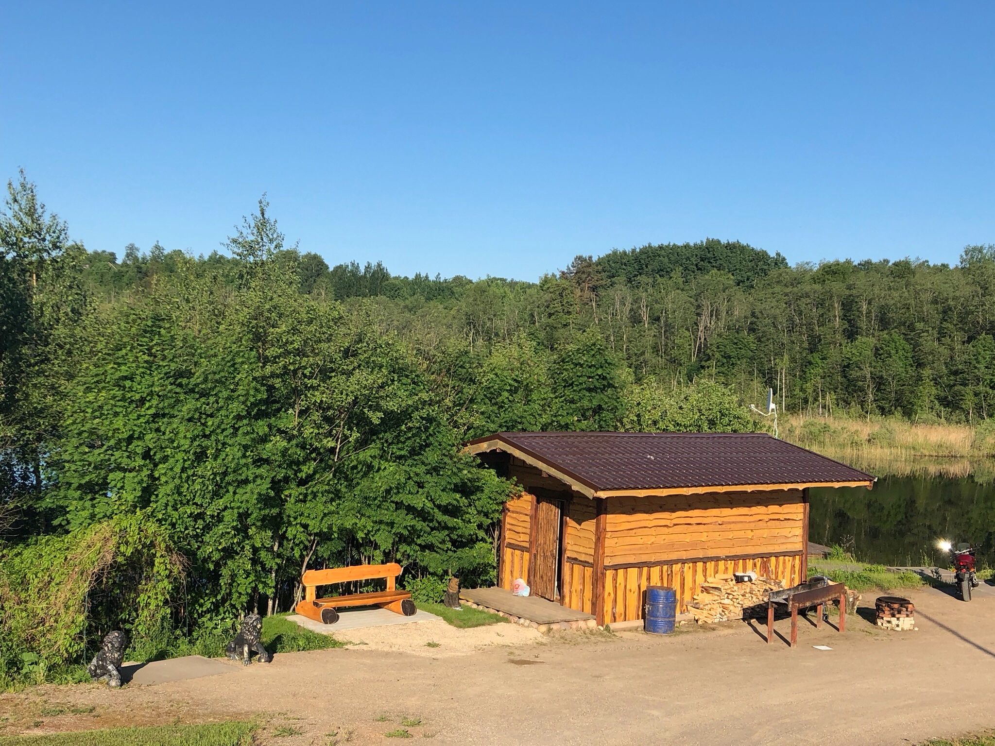 Прилетев на Валдай, мы попали в самолетный рай. Шикарная асфальто-грунтовая полоса (в Середине 300м идеальный асфальт, по краям не менее 100м идеального песчаного насыпного грунта), идеально подстриженные газончики. Также там и мотоциклы, и аквабайки, и удочки, и даже авто с ключами, если кому-то надо будет в город. Сама площадка располагается на берегу озера, на веранде холодильник с едой, в общем красота сказочная и коммунизм прямо в отдельно взятом месте. Радушный хозяин Сергей Алексеевич, которого мы почему-то прозвали дедом, сразу же усадил нас в свой внедорожник, накормил в ресторане, предложил на выбор три варианта размещения, и отвез нас обратно к самолету, зашвартовать, заправить да и отдыхать. Мы естественно выбрали домик прямо на аэродроме, ведь на следующий день нужно было пораньше выбраться в Псков, так как все-таки хотелось прорваться через границу, и сделать это непременно нужно было до 5 вечера пятницы, иначе в выходные ни Псков ни Тарту не работают, о чем было прочитано в АИПах.