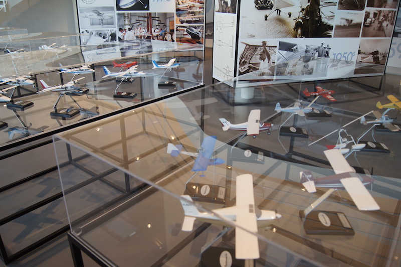 Под стеклянными витринами огромное количество моделей, выпускаемых за все время долгого (более 60-ти лет) существования Компании. Классические подкосные высокопланы, стремительные низкопланы, двухдвигательные поршневые и газотурбинные, и даже морской автожир-змей! Честно – никогда не знал, что история TECNAM насчитывает столько разработок. Вертикальные стенды с уникальными фото где запечатлены основатели с их многочисленными моделями самолетов.