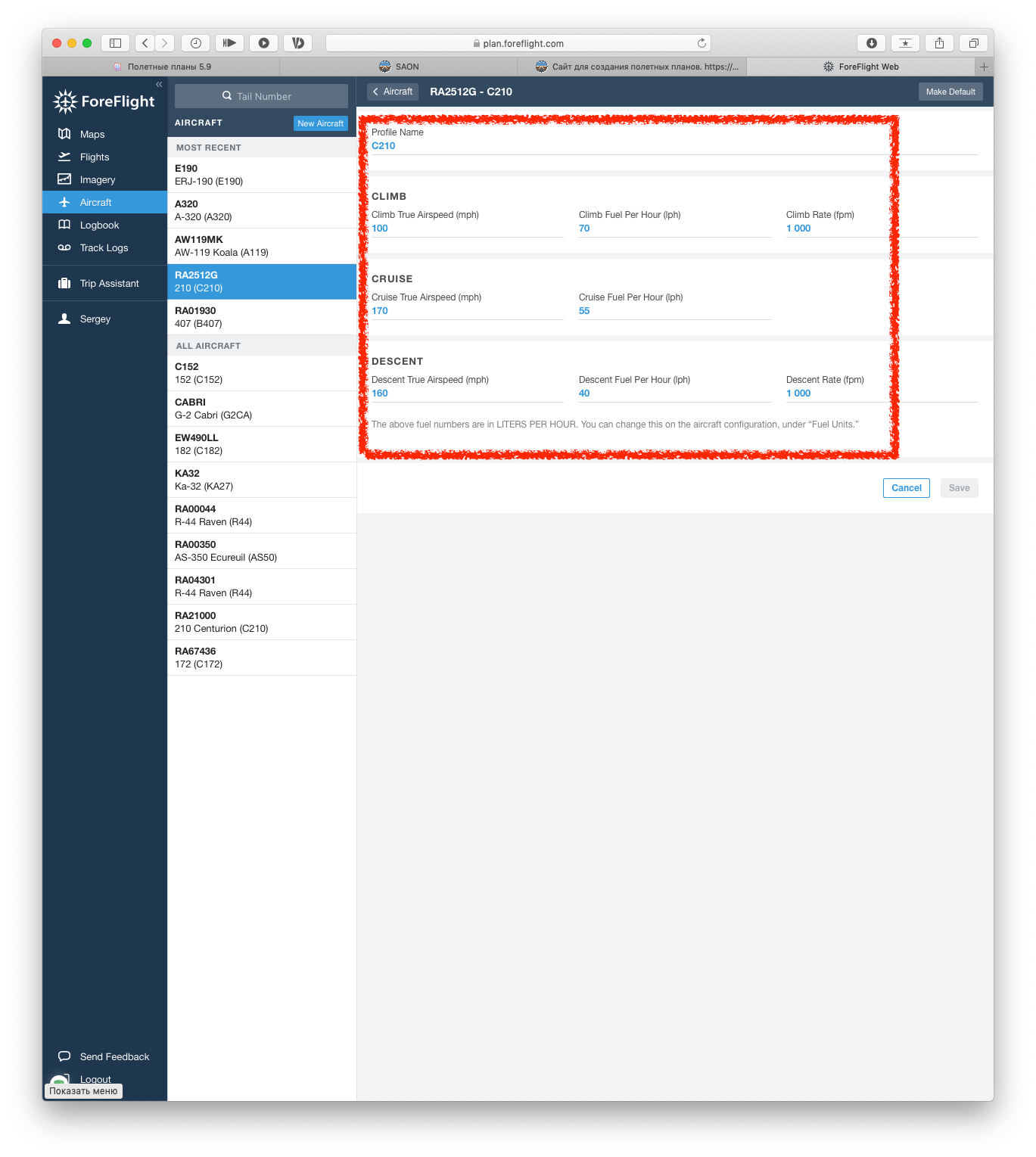 Есть еще одно предложение: усложнить профиль воздушного судна, добавив в него настройки скорости и расхода топлива хотя бы на трех основных этапах полета: набор/снижение высоты и крейсерский полет. Пример - ForeFlight - на скриншоте. Это позволит более точно рассчитывать расход топлива и полетное время.