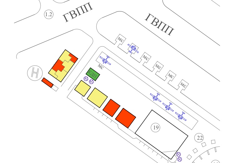 На данный момент сформирован план начальной застройки площадки. На рисунке показаны места под установку ангаров, а также будет возможность приобретения Т-образного места в блоке. Жёлтым цветом отмечены свободные места.