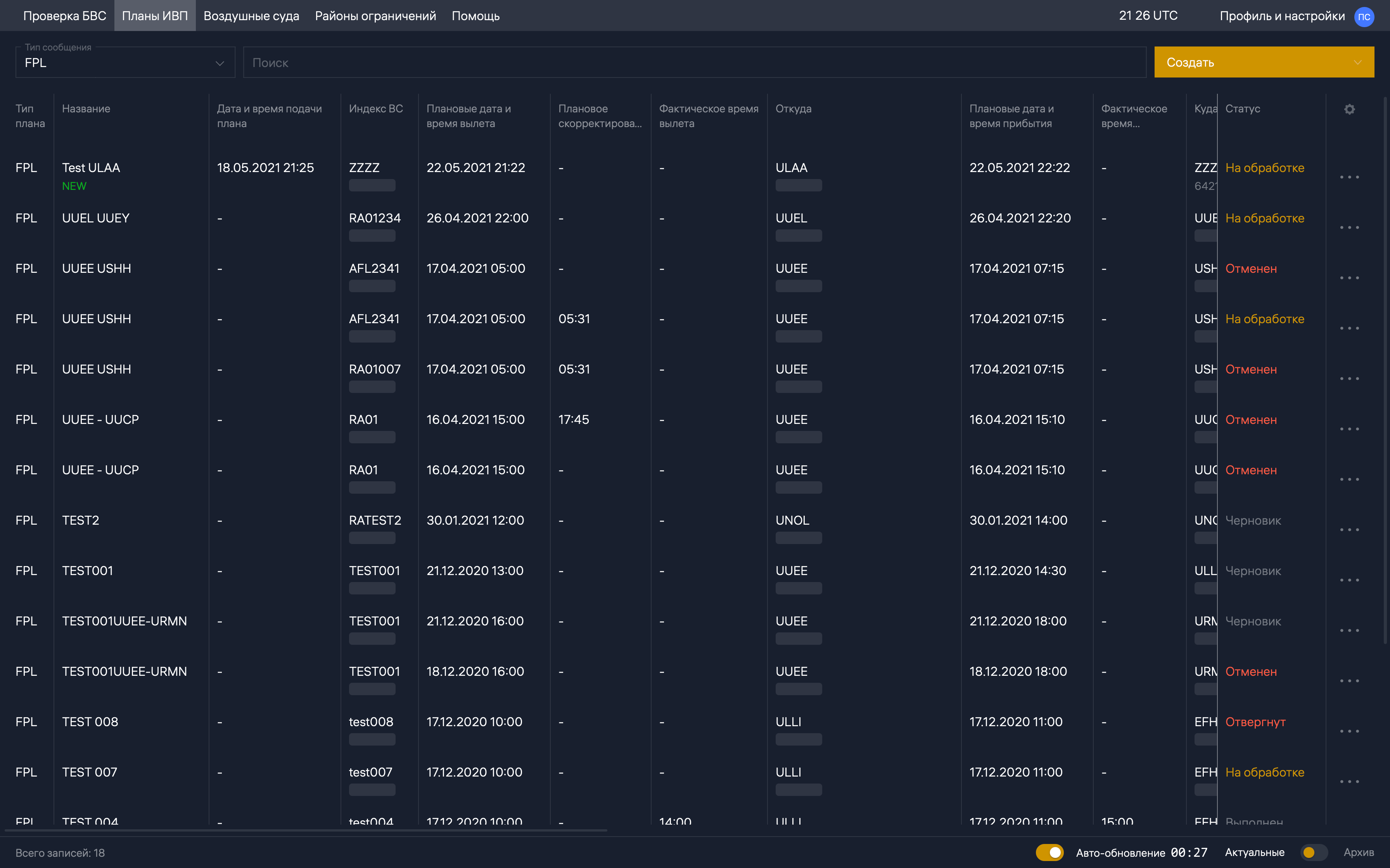 Тоже не согласен. Рассылка планов происходит полностью автоматически, анализируется высота полёта и зоны/районы/РПИ, через которые проходит маршрут полёта.uuee писал(а):Выбор точек "от БАЛДЫ" приводи к распределению вашего плана в другой сектор ОВД, которому вы совсем не интересны, а тот объект которому вы хотите передать свой план информации не получает. Так например вы выбрали точку, которая принадлежит ВТ, а эта ВТ находится в зоне РЦ и ваш план т.о. попадает(распределяется) в РЦ. Поэтому хорошо, что есть такая программа, которая фильтрует такие маршруты.