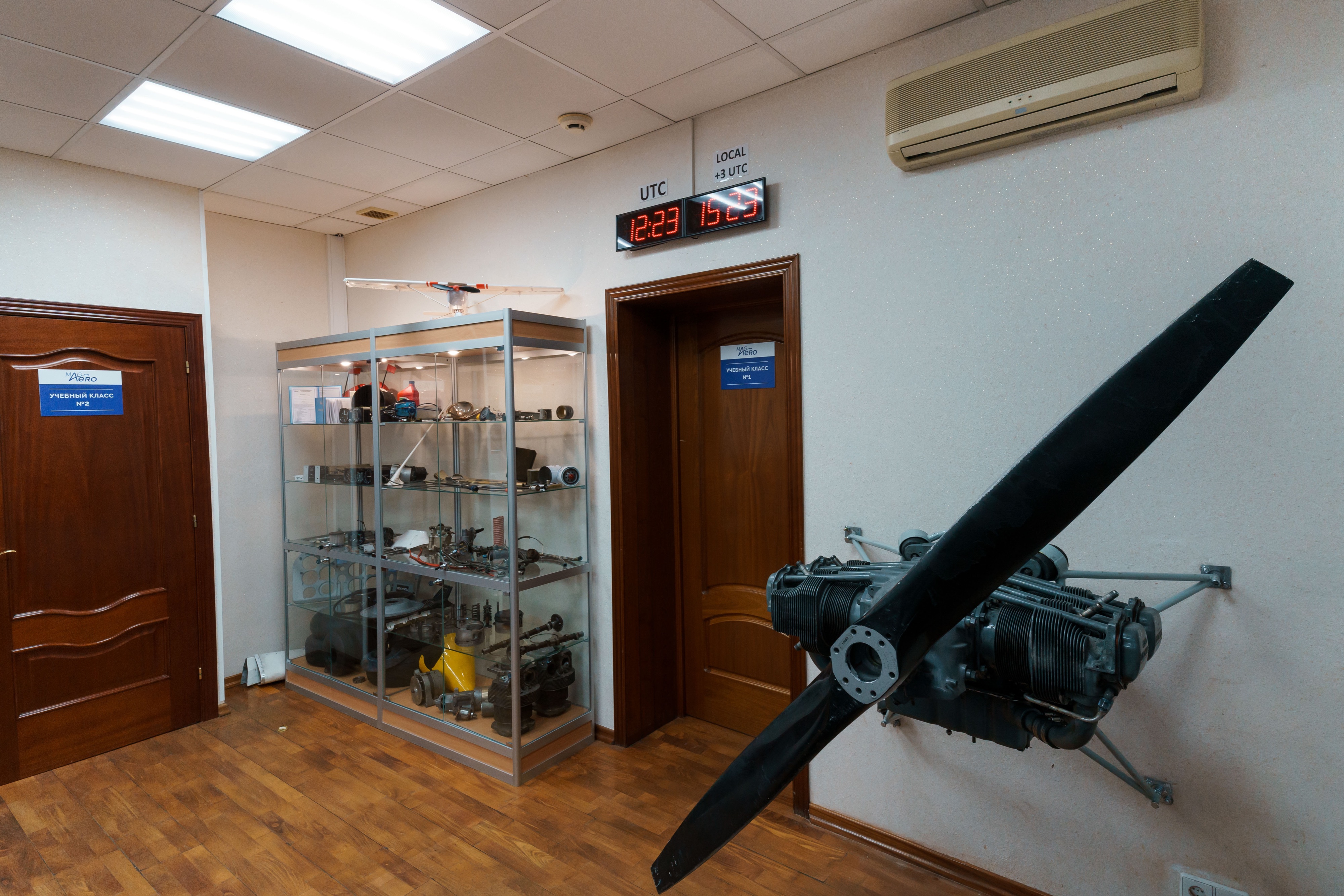 В общей зоне мы сделали небольшой авиа-музей с наглядным примером различных приборов от Cessna 172, а также установили двигатель Lycoming 320 - в рамках прохождения теории, например - общие знания по воздушным судам, очень важно рассматривать техническую часть на примерах, близко рассмотреть, покрутить в руках приборы. Помимо этого, в общей зоне нашего класса есть кофейная зона - слушатели в перерывах всегда могут обсудить занятие за чашкой горячего напитка.