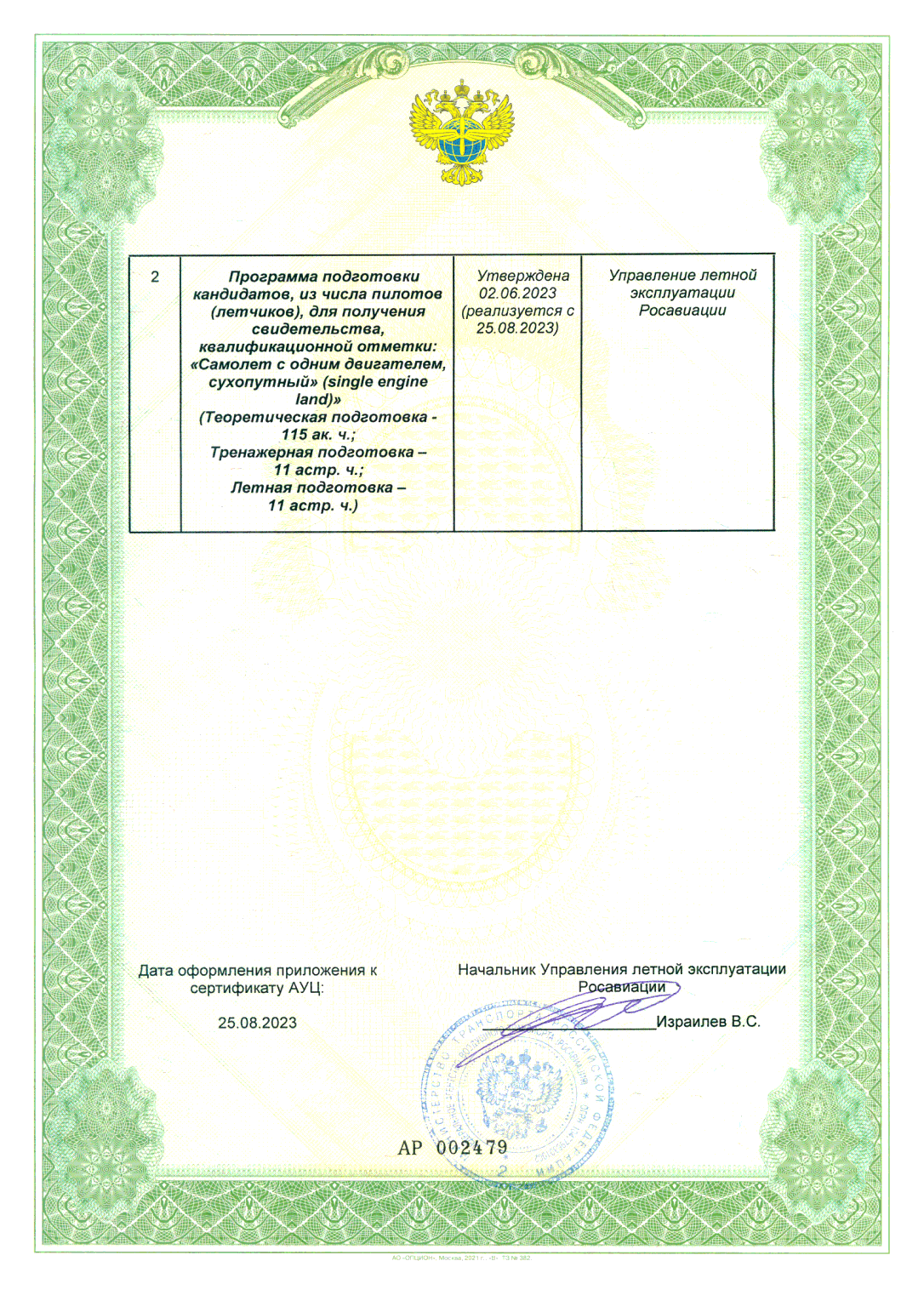 2. Программа подготовки кандидатов, из числа пилотов (летчиков), для получения свидетельства с квалификационной отметкой: "Самолет с одним двигателем, сухопутный (single engine land)"