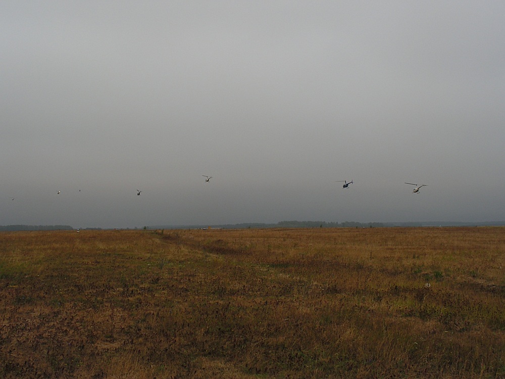 Приземлились на окраине поселка - и тут же к месту посадки сбежалось и съехалось несколько сотен жителей. Понятно, что семь вертолетов одновременно они никогда прежде не видели :-) В числе встречавших оказались глава района и начальник милиции. Они помогли нам подобрать площадку для вертолетов на ночь, начальник ОВД бесплатно выделил вооруженную охрану. ужинать в единственное кафе они нас не пустили, а отвезли на Газели с мигалками в продуктовый магазин. Там в подсобке был накрыт стол (за нехваткой стульев некоторые сидели на ящиках от водки), а на столе - домашние пельмени, которые привез из дома кто-то из руководителей района. В общем, встречали нас от души... Ночевали мы в гостинице в деревне с красноречивым названием Ненастье... Все это было бесплатно.