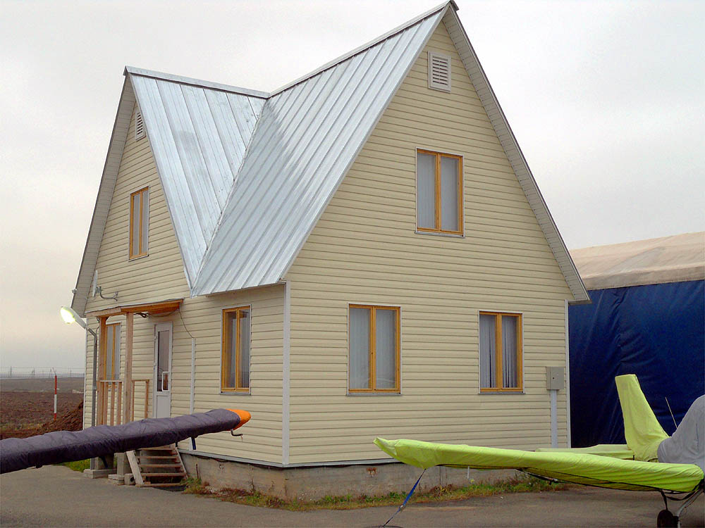 Я не стал выделяться и с самого начала задумал рядом с ангаром поставить домик. Чтобы не искать от добра добра, первым делом спросил, кто какие домики ставит. Оказалось выбор у всех единодушный - фирма "Зодчий". Эта фирма специализируется в продаже и установке готовых щитовых домиков, имея обширный выбор готовых архитектурных решений на разные площади и на разный кошелек. Расположена неподалеку (завод в Бронницах), а поэтому доставка бесплатная. Щитовой дом - это удобно. Для семьи и настоящей дачи я бы такой вряд ли выбрал, а вот для авиадачи - самое оно! Тыкаешь пальчиком в каталог, а дальше всё делают они - ставят фундамент и на нем возводят, как из конструктора Lego, домик из изготовленных серийно на заводе блоков и модулей.