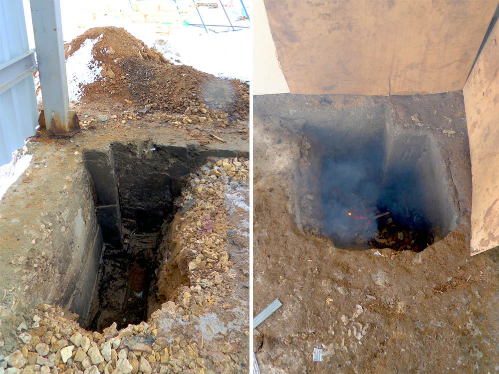 Тлеющий огонь отогревает мерзлый грунт. На фото глубина не передается, но человек туда в полный рост встает. Здесь будут залиты ж/б фундаменты под фермы антресоли и ворот