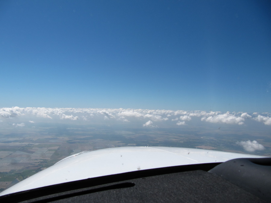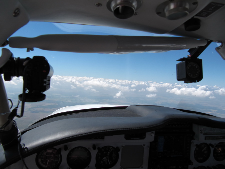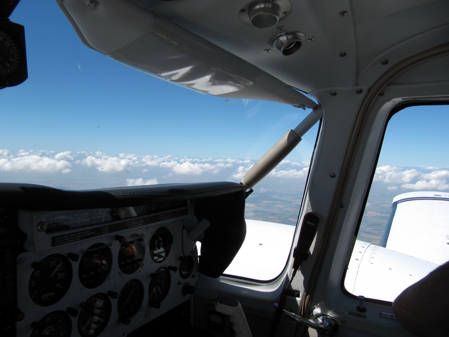 Сразу после взлета, решили идти в верх, искать попутный ветер. Набрав 1500, мы подошли к нижней границе облачности. Между землей и солнышком лежало одеяло облаков, судя по редким просветам не очень толстое. Его надо было пробить. Вот он кайф!! Сейчас мы пойдем в набор и через несколько секунд окажемся сверху этого одеяла. Наверное, это один из самых завораживающих, ответственных, напряженных моментов в пилотировании самолета! Установив горизонтальный полет, набираем максимальную скорость и штурвал на себя! Максимальная скороподьемность… самолет входит в облако, в салоне становится серо, все внимание на пилотажные приборы … стрелки дернулись, скорость стала падать, высота стремительно пошла вверх, смотрим на авиагоризонт, при отсутствии ориентиров, он становится самым важным прибором на самолете… 10 секунд, 20..30 кажется время остановилось мы сидим в сером коконе, напряженно всматриваемся в приборы, за стеклом не видно ничего ни двигателей ни крыльев… И вот , в серой массе за окном проявляются светло-желтые пятна… еще пять-семь секунд и мы выныриваем из серой ваты. Над нами абсолютно чистое , прозрачное небо и солнце… От увиденного перехватывает дыхание. Безумно красиво! Мы как огромный боинг , оди над этим морем облаков, набираем высоту, все выше и выше. Стрелка высотомера остановилась на 8500. Отличная высота, ветер почти не мешает, путевая скорость не опускалась меньше 140 узлов. С этой высоты одеяло облаков кажется плотным и слегка неровным, как шерсть барашка. Навигатор показывает до Эль Пасо 3,5 часа. Делать особо нечего, включаем автопилот и отпускаем штурвал… красота! Задний ряд,- бизнес класс сразу погрузился в спячку, собственно больше там делать нечего…