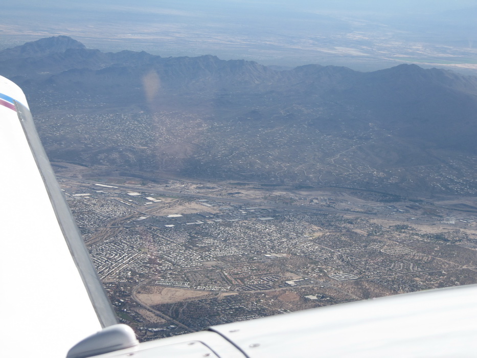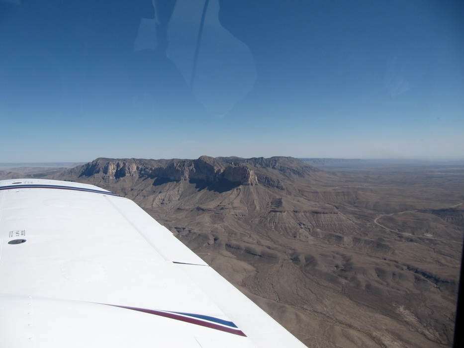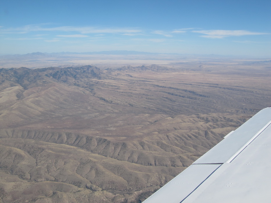 Через какое-то время слой облачности заканчивается, мы пролетаем над краем одеяла и под нами оказывается земля. Сначала, она была «обычная»- зеленая, потом все чаще стали появлятся серые и красные цвета. Через какое-то время, зелень пропала и уступила место песку и камню. Земной рельеф постепенно менялся, сначала высота его была 500-1000 футов, потом 2000 и к Эль Пасо достигла 4000. Соответственно высота над поверхностью земли у нас упала до 4500.