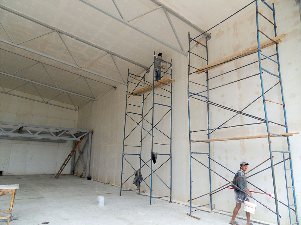 1. Приведение в порядок стен (шпатлевка швов) и внутренняя окраска здания и металлоконструкций. За отчетный период эти работы шли полным ходом, что и видно на фото. Кропотливо шпатлюются и заклеиваются серпянкой швы. Поверхность готовится к малярке.