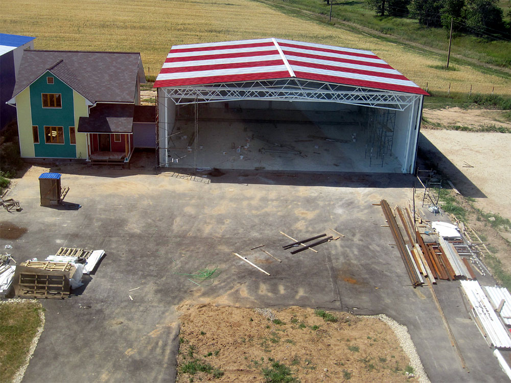 Прошедшие 2 недели были затрачены на то, чтобы, наконец, закончить ангар. Нет, он еще не готов окончательно для сдачи в эксплуатацию. Для этого должны быть еще сделаны бетонная стяжка пола и главные ворота. Но, во всяком случае, все стены и крыша полностью перекрыты и утеплены, устранены все недоделки. Крыша, которая так долго "мозолила глаза" мне своей незаконченностью, теперь выглядит так, как было задумано. Не удержался, чтобы не облететь ангар и не сфотографировать эту завершённость. Как видите, на крыше появился конёк. Наружные углы стен закрыты уголком. Им же подшито примыкание крыши и стен с наружной стороны. Кроме того, сделан нависающей козырёк по фасаду, который будет защищать от осадков верхнюю часть ворот (там, где механизмы).