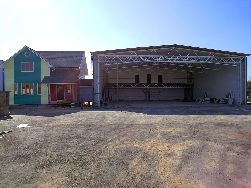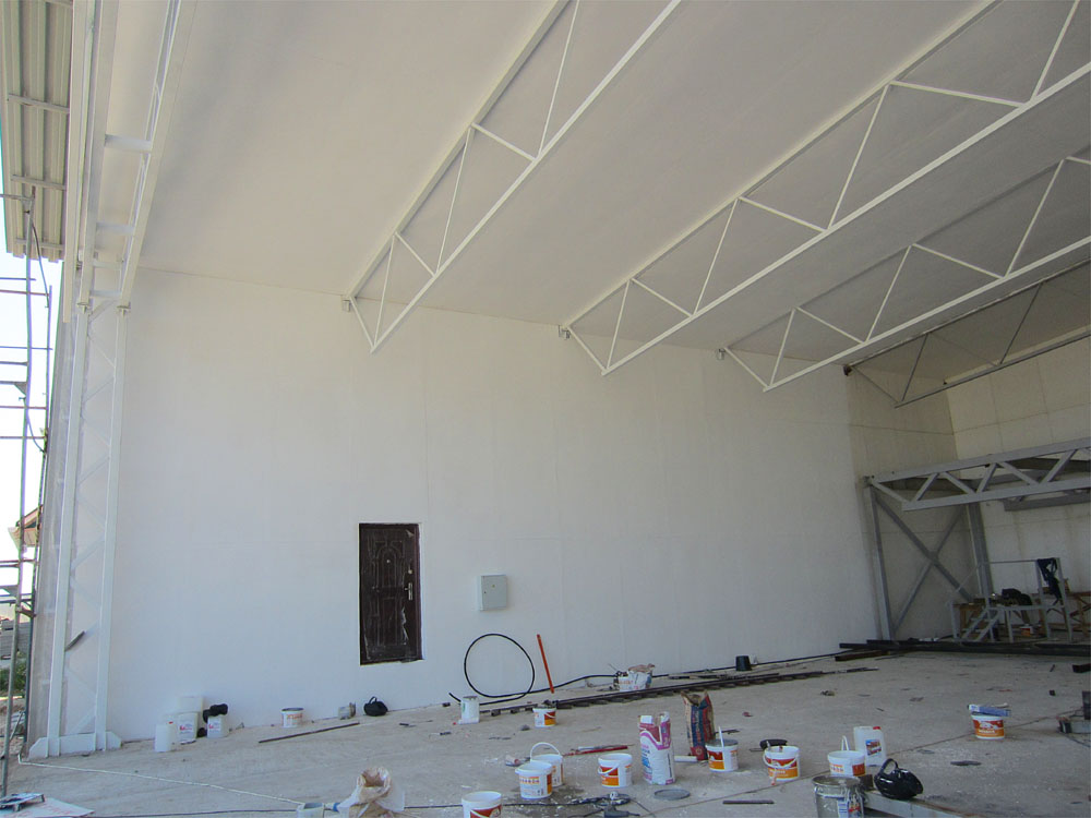 К этому времени завершена подготовка стен к малярным работам. А затем все стены, за исключением антресольной части, (там будут еще вестись работы) приведены в порядок и покрашены. То же самое с фермами. Покрашенное в беленькое, всё стало выглядеть намного аккуратнее и чище. Да и света потребуется куда меньше, чтобы хорошо осветить внутренность ангара.