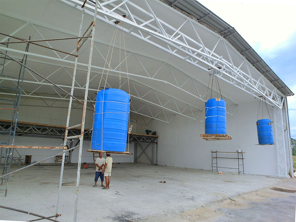 Чтобы проверить прочность конструкции, на которой позже будут смонтированы ворота, решено провести статические нагрузочные испытания. Три больших пластиковых бочки равномерно подвесили по всей ширине несущей фермы и в каждую залили по тонне воды. Итого - три тонны. И так - неделю, с постоянным контролем прогиба фермы. Всё идеально! Прочность и надежность - превыше всего!