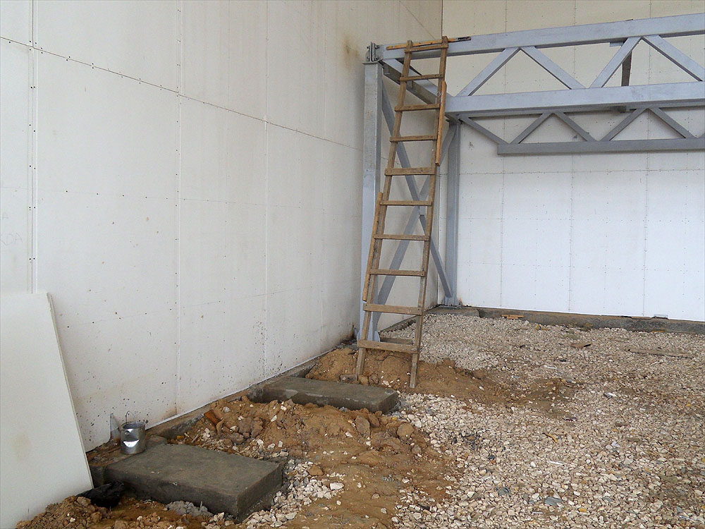 Некоторая задержка вышла с заливкой бетоном антресоли. Идеи по организации пространства второго этажа потребовали дополнительных расчетов прочности конструкции (все должно быть надежно!). Сейчас эти задачи решаются и в ближайшие дни будет осуществлена заливка бетонного перекрытия по несъемной опалубке. Это самые ближайшие планы. Одновременно начались малярные работы по отделке внутренностей ангара. Все швы между облицовочными стекло-магниевыми плитами будут проклеены серпянкой, швы, щели и неровности зашпатлеваны, а затем пойдет окраска в 2 слоя. Кроме того, все металлоконструкции (фермы, опоры и перекрытия) которые сейчас окрашены противокоррозийной серой краской, будут тоже окрашены белой краской. Вся внутренность ангара, таким образом, будет белой, что правильно для организации внутреннего освещения.