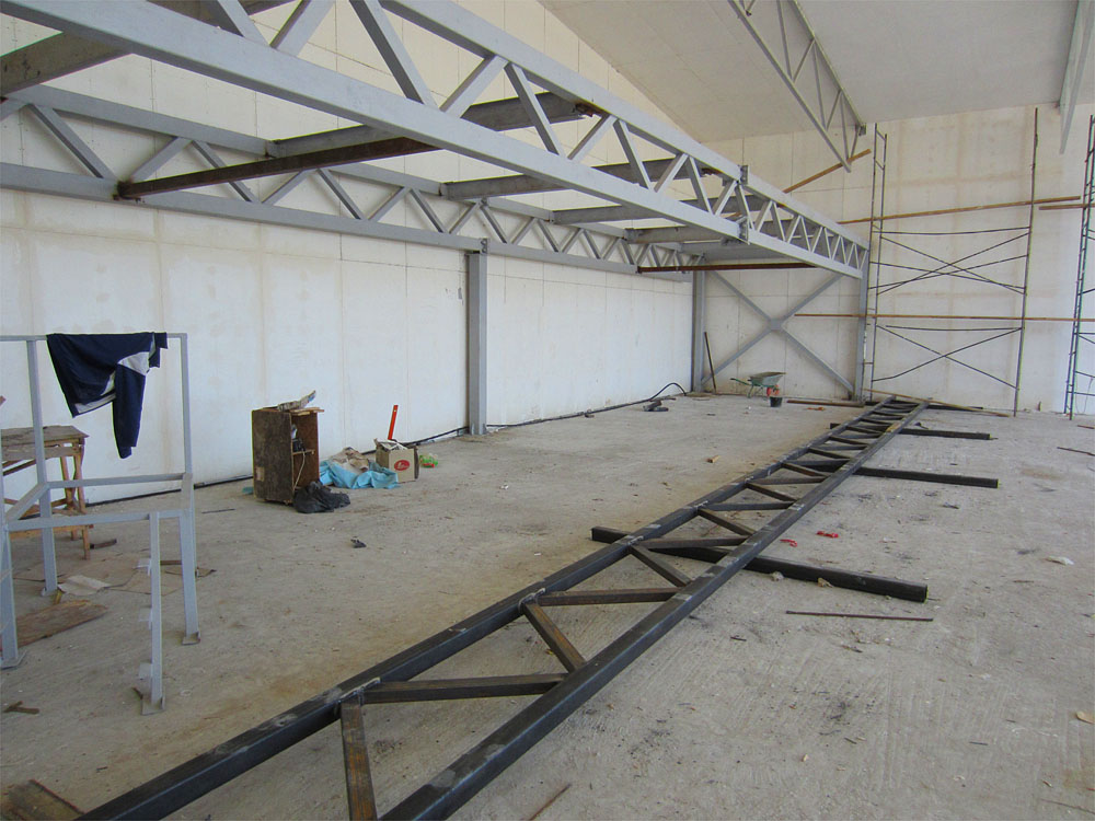 К этому времени завершена подготовка стен к малярным работам. А затем все стены, за исключением антресольной части, (там будут еще вестись работы) приведены в порядок и покрашены. То же самое с фермами. Покрашенное в беленькое, всё стало выглядеть намного аккуратнее и чище. Да и света потребуется куда меньше, чтобы хорошо осветить внутренность ангара.