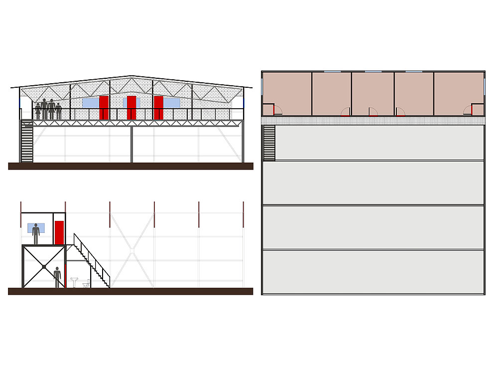 Тот самый балкон-переход ради которого проектировали дополнительную силовую ферму. На антресольном этаже пять изолированных помещений. В левое и правое вход с боков, через тамбур, в три центральных - с балкона.