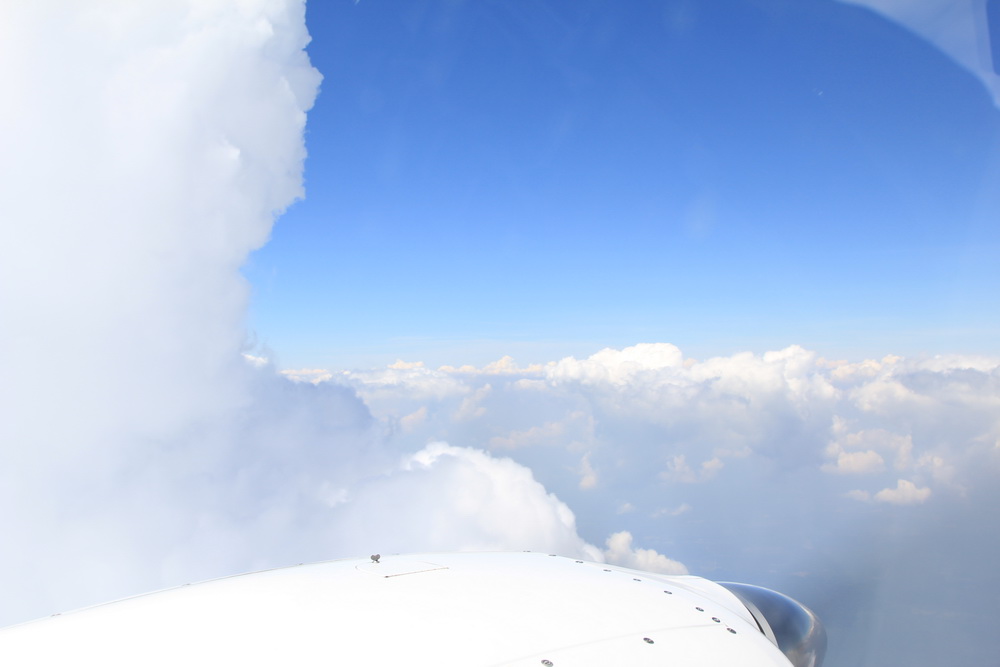 Девять так девять... Набираем, сейчас будем пробивать облачность, немного волнуюсь. Не часто я пробивал облачность, вообще я очень мало до этого летал по приборам, но кое какой опыт все же есть. Заходим в облака, начинает слегка потряхивать, 6000, 7000, 8000 пробиваем верхнюю кромку и идем выше. 9000 как раз получается над облаками, они редкие но их много, в разрывах видно землю. Я абсолютно беззаботный, как котенок, который играется и не знает что его ждет впереди. Пока все замечательно, мы летим, все в порядке, я беззаботно играюсь с облаками иногда их фотографируя. Немного скучновато, никаких пейзажей, просто летим от одной группы облаков до другой, так низко , что иногда они оказываются выше нас и если есть возможность я пролетаю сквозь них получая порцию адреналина и удовольствия.