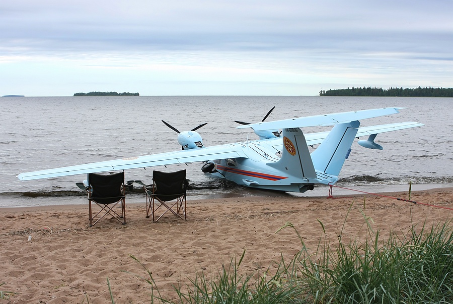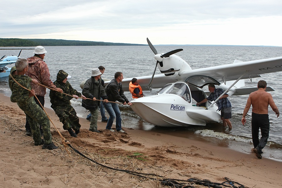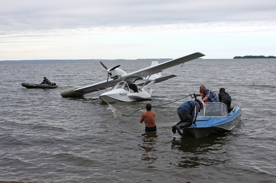 Однако, приходиться оторваться от еды, питья, общения - на берегу озера подходит к завершению операция по спасению попавшего в неприятности при посадке Пеликана. Волнами оторвало правый буль-поплавок: