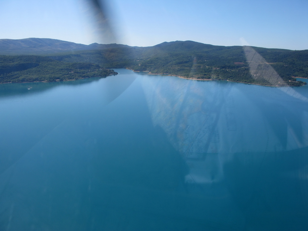 И тут впереди видим красивейшее озеро Lac de Castillon соединенное узкой протокой с Retenue de Chaudanne и не вынесла душа поэта - отворачиваем к озеру. Оно наполовину находится в запретке, так что мы подходим максимально близко к этой запретке и снижаемся в сторону озера.