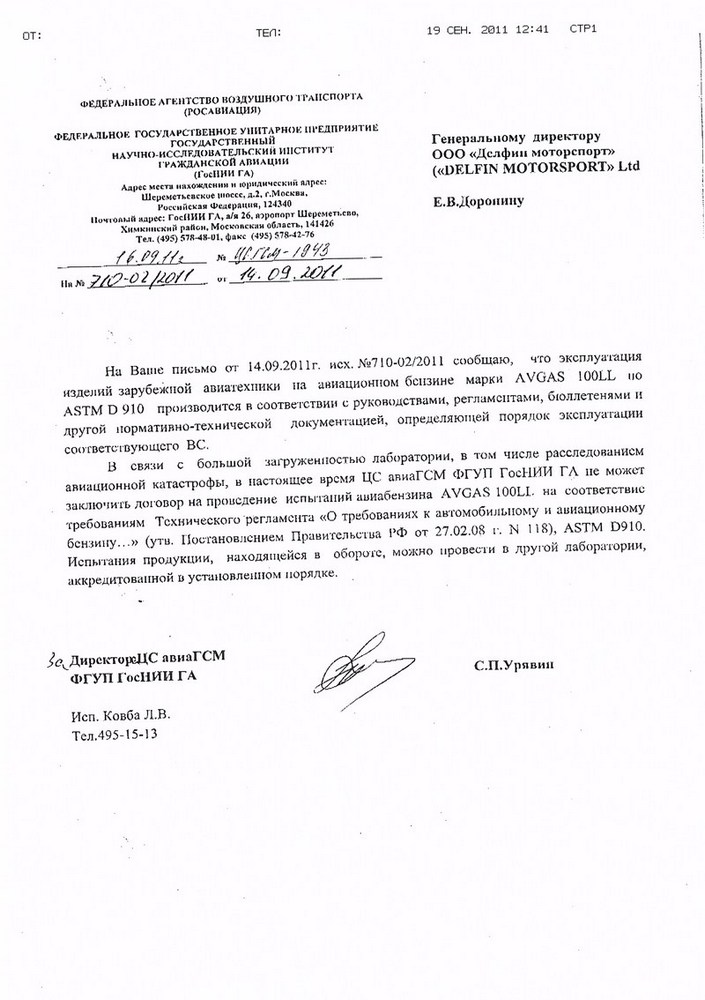 Мы давно мечтали найти альтернативу авиационному бензину марки AVGAS 100LL производства SHELL с аналогичным качеством и более привлекательной ценой. После проведенных переговоров с компанией Conoco Phillips, США, нам удалось завезти на территорию РФ в Москву первые 50 тонн топлива,провести таможенную очистку, получить обязательный сертификат соответствия с проведением в полном объеме сертификационных испытаний на соответствие требованиям технического регламента, в том числе и по показателю сортности .Пришлось очень трудно общаться с НИИГА, где мы получили заключение,что оформление допуска на использование новой, на территории России марки бензина на воздушных судах малой авиации импортного производства не требуется. А допуск к сожалению необходим только для судов гражданской авиации российского производства, который мы надеемся получить постепенно после проведения всех необходимых установленных этапов работ.Стоимость бензина фасованного в 200 литровую бочку получается 104 рубля за килограмм а это уже дешевле чем у SHELL и появляется возможность отправлять бочки с бензином в любую точку РФ.Прилагаю ниже все документы.