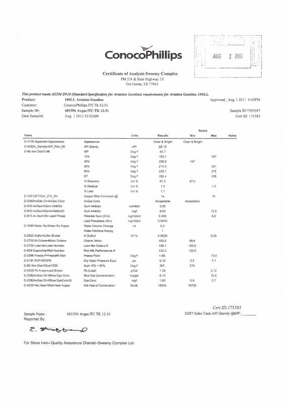 Мы давно мечтали найти альтернативу авиационному бензину марки AVGAS 100LL производства SHELL с аналогичным качеством и более привлекательной ценой. После проведенных переговоров с компанией Conoco Phillips, США, нам удалось завезти на территорию РФ в Москву первые 50 тонн топлива,провести таможенную очистку, получить обязательный сертификат соответствия с проведением в полном объеме сертификационных испытаний на соответствие требованиям технического регламента, в том числе и по показателю сортности .Пришлось очень трудно общаться с НИИГА, где мы получили заключение,что оформление допуска на использование новой, на территории России марки бензина на воздушных судах малой авиации импортного производства не требуется. А допуск к сожалению необходим только для судов гражданской авиации российского производства, который мы надеемся получить постепенно после проведения всех необходимых установленных этапов работ.Стоимость бензина фасованного в 200 литровую бочку получается 104 рубля за килограмм а это уже дешевле чем у SHELL и появляется возможность отправлять бочки с бензином в любую точку РФ.Прилагаю ниже все документы.