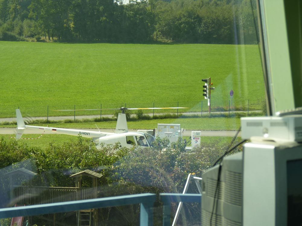 Сели на заправку в Йезенванг (рядом с Мюнхеном). Поперек ВПП (в торце) идет автодорога, и во время захода на посадку дисп на светофоре включает красный. Машины стоят и пропускают. На картинке как раз виден светофор
