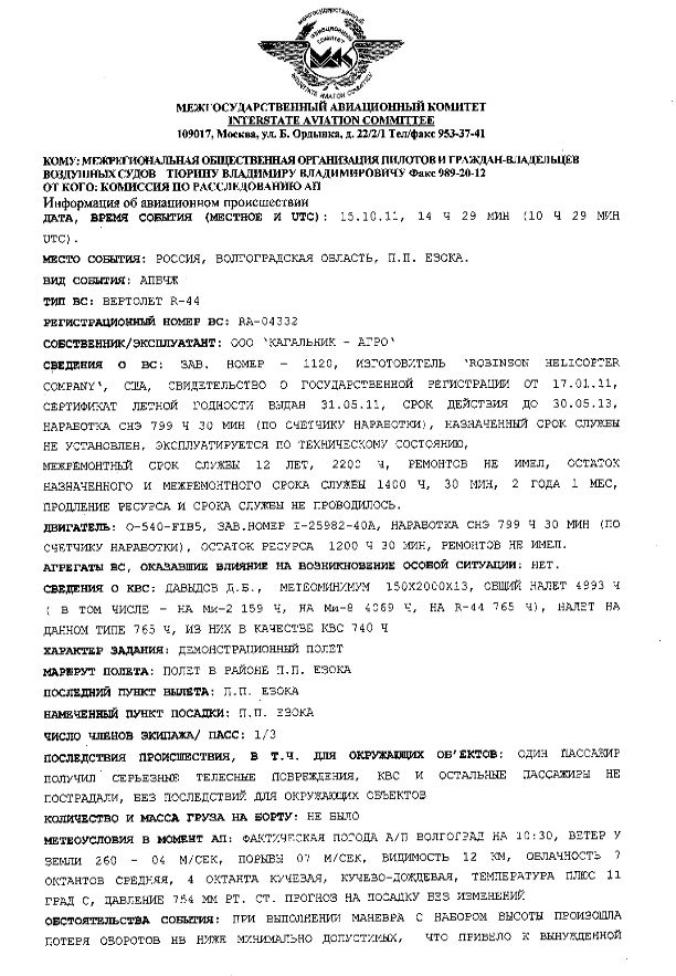 1. 15 ОКТЯБРЯ 2011 ГОДА В 10ЧАС. 33МИН (UTC) ПРОИЗОШЛО АПБЧЖ С ВЕРТОЛЕТОМ R-44 RA-04332 МТУ ЦР, ПРИНАДЛЕЖАЩЕГО ВЕРТОЛЕТНОМУ КЛУБУ АЭРОСОЮЗ.