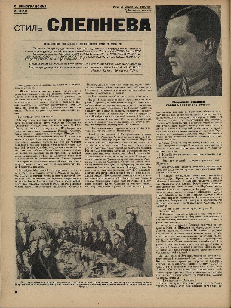 Три этих летчика – Н. Каманин, В. Молоков, М. Слепнев, а также – А. Ляпидевский, И. Доронин, М. Водопьянов и С. Леваневский за участие в челюскинской эпопее получают ордена Ленина и впервые в истории – звание Героев Советского Союза.