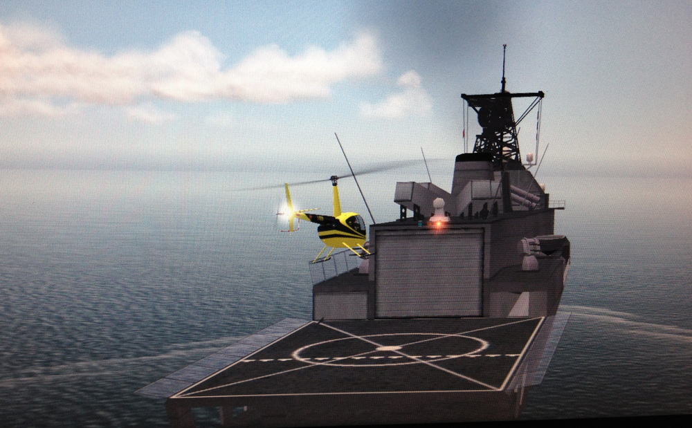 А так выглядит картинка на мониторе инструктора (пробуют садиться на корму идущего корабля, в динамике прописана даже качка.