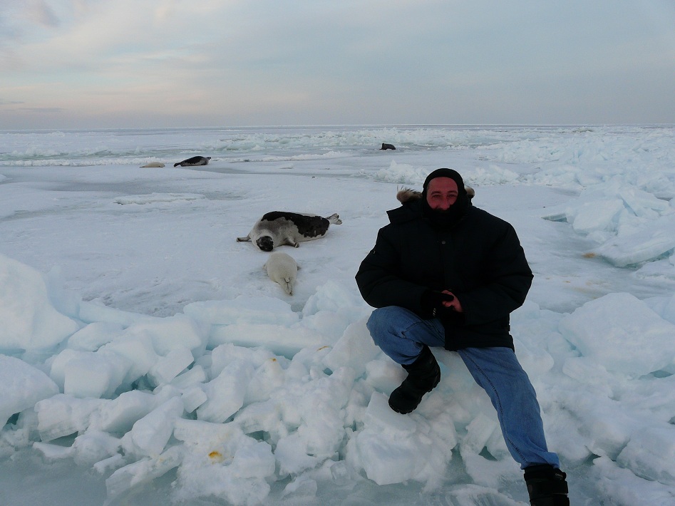 И вот, на горизонте наконец-то появились льдины нормального белого цвета. А на них зверьё местное. Кто-то тикал от вертолётов, а кто-то уже привык и продолжал делать свои дела. Садимся. Посадка сюда тоже интересная. Прежде чем до конца опустить шаг и убрать обороты, нужно было пару раз конкретно стукнуть вертолёт о лёд, чтобы проверить прочность льда.
