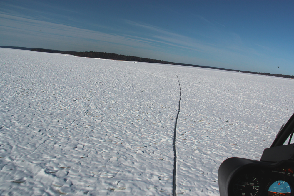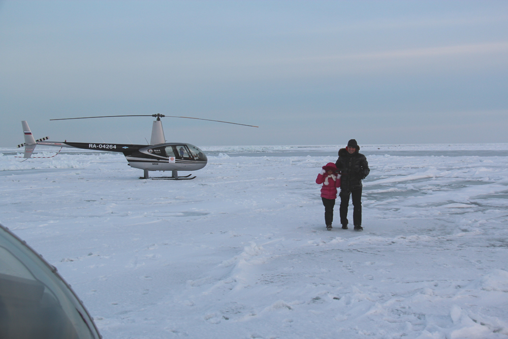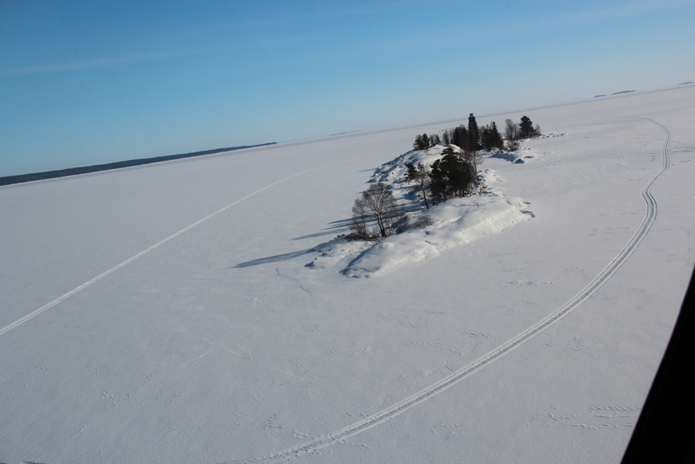 Утро 11 марта. Все рано встали и без завтрака спустились к вертолётам. Пока залили масло упаковались и прогрелись, рассвело. Опять вылетаем на Онежский залив. Летим низко, чтобы цепляться глазами за неровности на льду. Горизонтальная видимость хорошая и скоро мы увидим землю. Ура!
