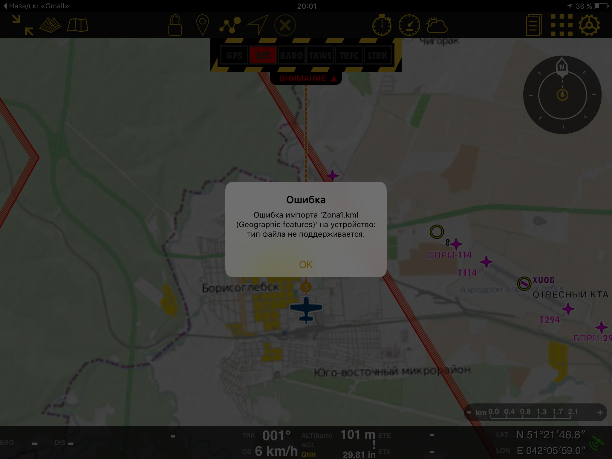 Я с первого раза успешно установил ваши KML-файлы на свой айпад.Зоны нормально отображаются на карте, но, как я и предупреждал, только в масштабе менее 10 км:Я бы вам порекомендовал установить iExplorer. Джэйлбрейк никакой не нужен - программа прекрасно работает со всеми маковскими устройствами без него. В структуре папок ANP найдите папку Inbox и попробуйте удалить ненужные файлы KML, а также в корневой папке удалите файл User_kml_documents.sql - для чистоты эксперимента. В этот файл импортируются все данные из файлов KML в папке Inbox, но даже при ручном удалении файлов KML из меню Geographic features они не исчезают из папки Inbox. Возможно в этом проблема. После этого перезагрузите устройство через ВЫКЛ+HOME для очистки кэша устройства. Это уж на самый всякий случай.Еще один совет: при экспорте KML-файлов указывайте цвет линии границы в Google Earth. У меня ни одна зона не отображалась, пока я вручную не установил цвет границ. Чуть бошку не сломал, пока додумался. Может это только у меня такая проблема?dd8bb писал(а):.kml создаю программой Google Earth