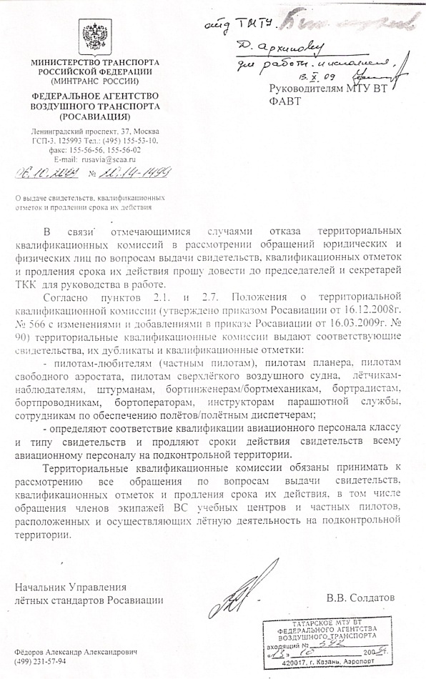 2. Копию данного распоряжения направить руководителю авиационного учебного центра АУЦ ФГУП «РСК «МИГ» (сертификат № 43) и руководителю МТУ ЦР Федерального агентства воздушного транспорта.