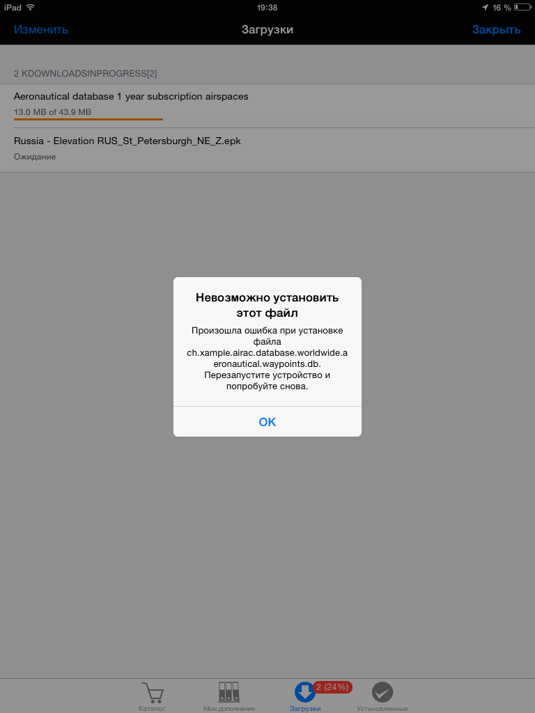 Подскажите, кто ставил платные базы данных airspace и waypoints, все ли нормально устанавливается? У меня выдает такое сообщение (см фото) и похоже ничего не ставится! Старые бесплатные базы стоят. Причем вначале обновил их (бесплатные), потом прочитал что вышли платные с ежемесячным обновлением, и решил приобрести :? Есть ли вообще возможность отследить актуальность баз в программе? :shock: